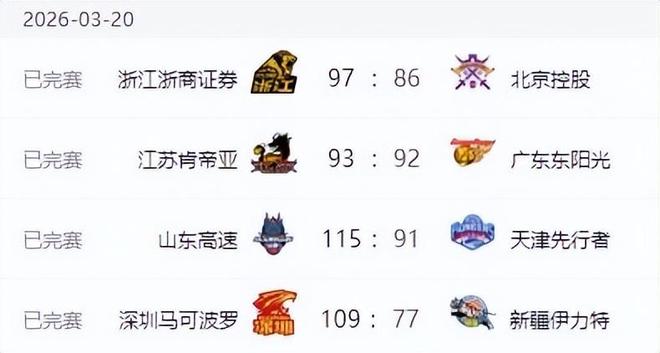 在其他三场同时进行的比赛中,广厦男篮以97-86战胜了北控男篮,山东男篮以115-91大胜了天津男篮,深圳男篮则是以109-77的比分送给新疆男篮一场32分的惨败。