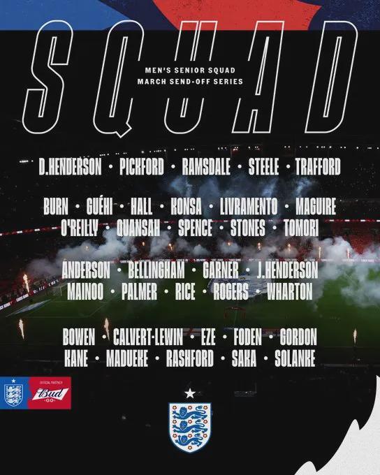 英格兰公布了最新一期大名单,赖斯、埃泽、马杜埃凯、萨卡入选。